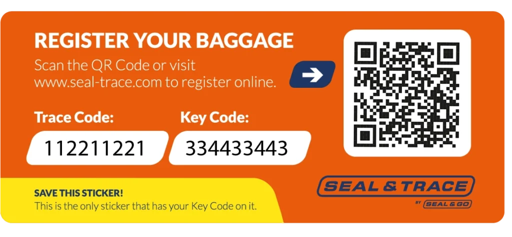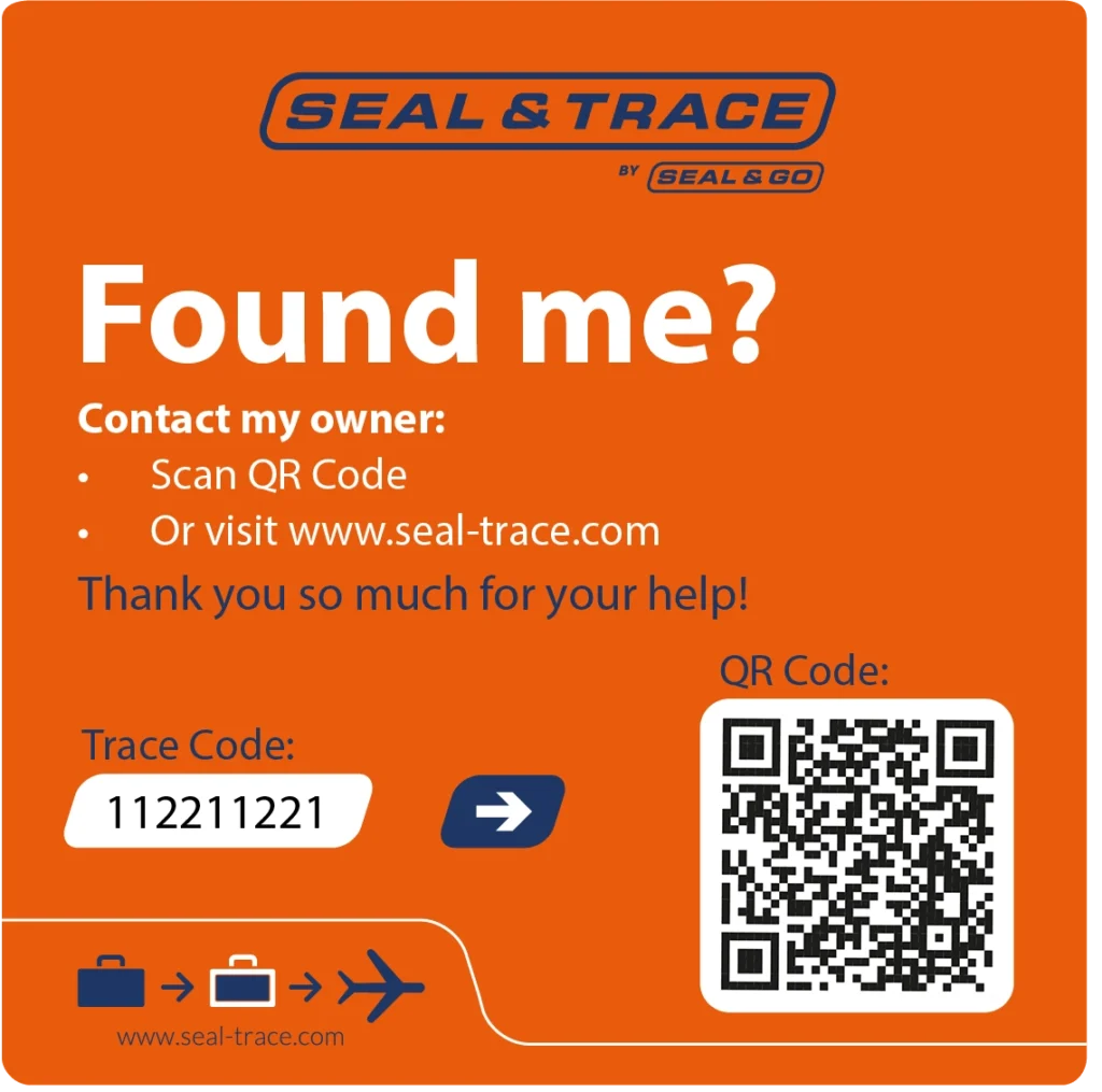 De Seal & Trace sticker op de bagage instrueert de vinder van de bagage om de QR-code te scannen met een smartphone of in te loggen op de Seal & Trace-website.
